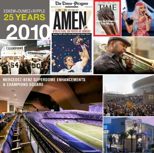 In preparation for the 2013 Superbowl, Eskew+Dumez+Ripple and Ellerbe Beckett, in a joint venture, began work on a $190 million dollar enhancement package to one of the city’s most iconic and recognizable structures: the Mercedes Benz Superdome. No small undertaking, the improvements—new scoreboards, video boards, sound and lighting system, concession stands, box suites, club lounge, elevators, windows and seating bowl, additional suites and retail vendor opportunities--were carefully phased to accommodate the facility’s dynamic schedule of ongoing events. Champions Square—a 60,000 square foot outdoor public space—a separate, yet equally important project, was realized in the 6-month break immediately following the Saints’ Superbowl victory. Doing so created one of the largest public spaces in the city that plays host to the pre- and post-event activity at the Mercedes Benz Superdome and New Orleans Arena.