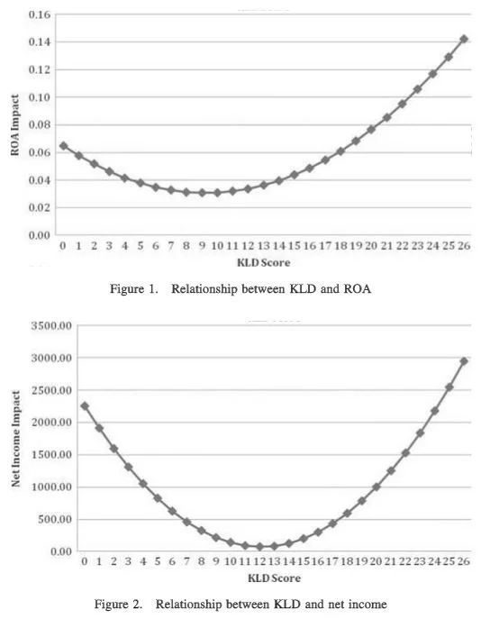 Barnett and Salomon's statistical analyses found that return on assets (ROA) positively correlated to the prior year's ROA, the firm's net income, and their investment in advertising. ROA also increased when social performance increased, but in a U-shape. ROA negatively correlated with larger debt burdens and greater R&D intensity. In general, service-based industries performed better than manufacturing industries. Net income correlations also were found to be strongly related to the prior year's net income and the current year's net income. At first the correlation between KLD score and net income was unclear, but once service and manufacturing industries were separated, the same U-shaped correlation was found.