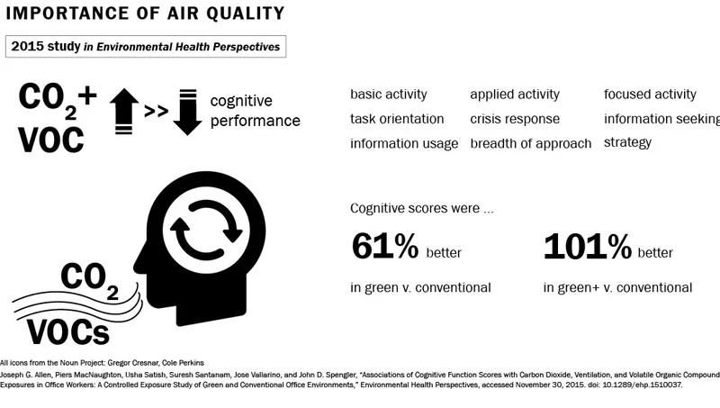 The 2012 study implies that poor air quality negatively affects people's performance at work and may affect some people more strongly than others. It compared cognitive scores in 9 categories (as listed above) at different CO2 levels: 600ppm, 1000ppm and 2500ppm. The participants were unaware of what was changing about their environment. In 7 of the 9 categories, the raw scores consistently decreased as CO2 level increased. Note that while extremely high, the 2500ppm occurs in indoor environments even today: surveys of elementary school classrooms in California and Texas found "a substantial proportion exceeded 2,000ppm and for 21% of Texas classrooms, peak CO2 concentration exceeded 3,000ppm." To check out the full study, click here.