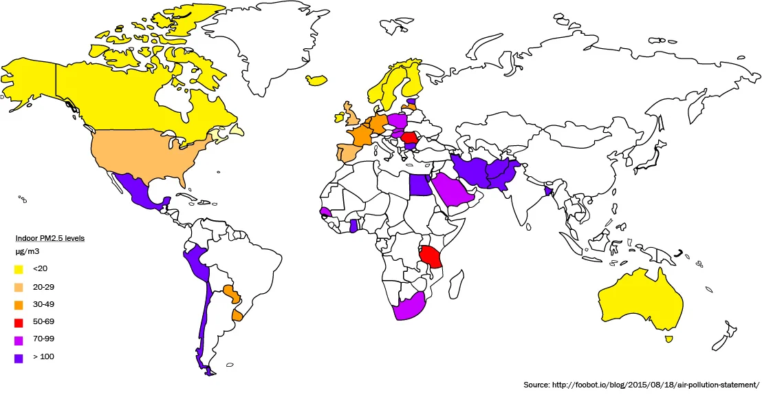 We spend 90% of our time indoors. Indoor air quality is a problem throughout the worl and indoor pollution levels are up to 8 times higher than outdoors. Indoor air pollution is linked to various deadly diseases like ischaemic heart disease and lower respiratory infection. The darker and cooler colored zones represent areas with higher indoor air pollution, while the lighter, warmer colored zones represent areas with lower indoor air pollution. (A specific threshold has not been determined internationally for what is a dangerous level, but PM levels in the Cognitive Effects study mentioned in the last post found levels ranging from 1.26 to 3.35 ug/m3.)