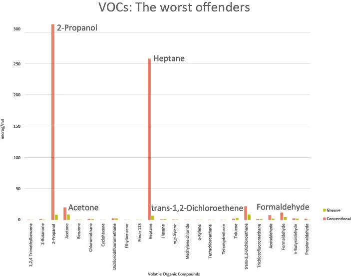 A VOC or volatile organic compound is any compound of carbon (excluding carbon monoxide, carbon dioxide, carbonic acid, metallic carbides or carbonates and ammonium carbonate), which participates in atmospheric photochemical reactions. The graph below shows which VOCs were the worst offenders in the recent study: "Associations of Cognitive Function Scores with Carbon Dioxide, Ventilation, and Volatile Organic Compound Exposures in Office Workers: A Controlled Exposure Study of Green and Conventional Office Environments."