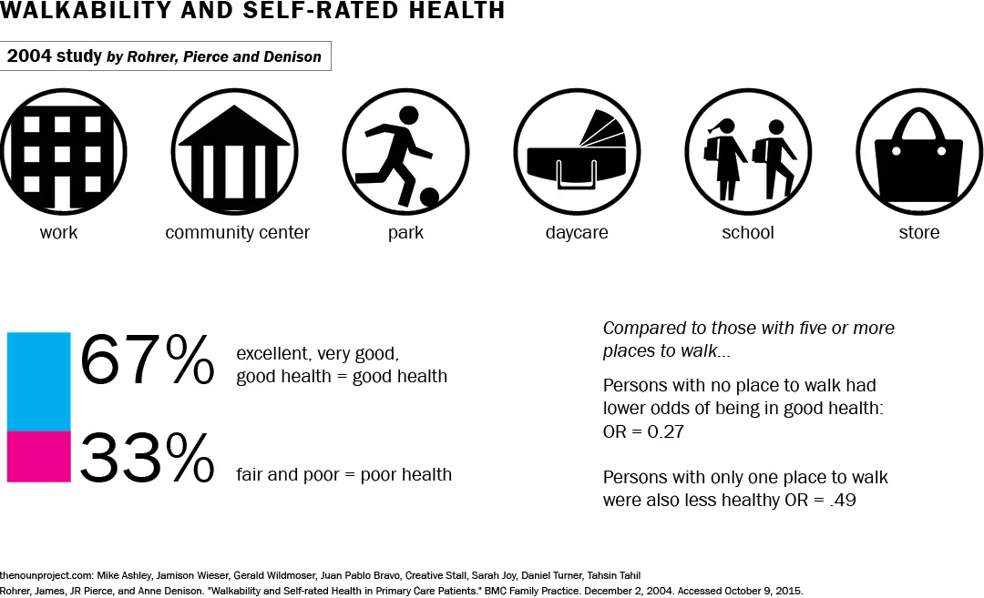 This 2004 study borrowed the methodology for measuring walkability from the 2003 study above, asking hundreds of patients from three clinics how many critical places they were able to walk to from their neighborhood. The study then asked them to rate their own health. People with five or more places to walk had better odds of reporting that they are in good, very good or excellent health.