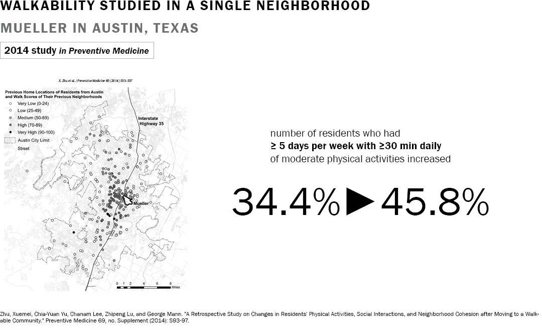 Finally, this more recent study looked at walkability within a single neighborhood, Mueller in Austin, TX. The community will accommodate 10,000 residents and 10,000 employees once it is fully completed in 2018. About 25% of the housing units are affordable and reserved for households with incomes lower than the area median. (Somewhat different from Celebration, Florida). This study asked eople about their physical activity before and after a move to a walkable neighborhood. The recall period ranged from 1 month to 6.4 years, with a mean of 2.9 years. Although only 34.4% of the group was active 5 or more days a week, 30 or more minutes a day, almost 46% were active after their move. The study also found that people had a greater sense of neighborhood cohesion and more social interactions after the move. However, some of this may have been the result of a "honeymoon" feeling after having moved to their new place of residence. More studies of this type would need to be conducted.