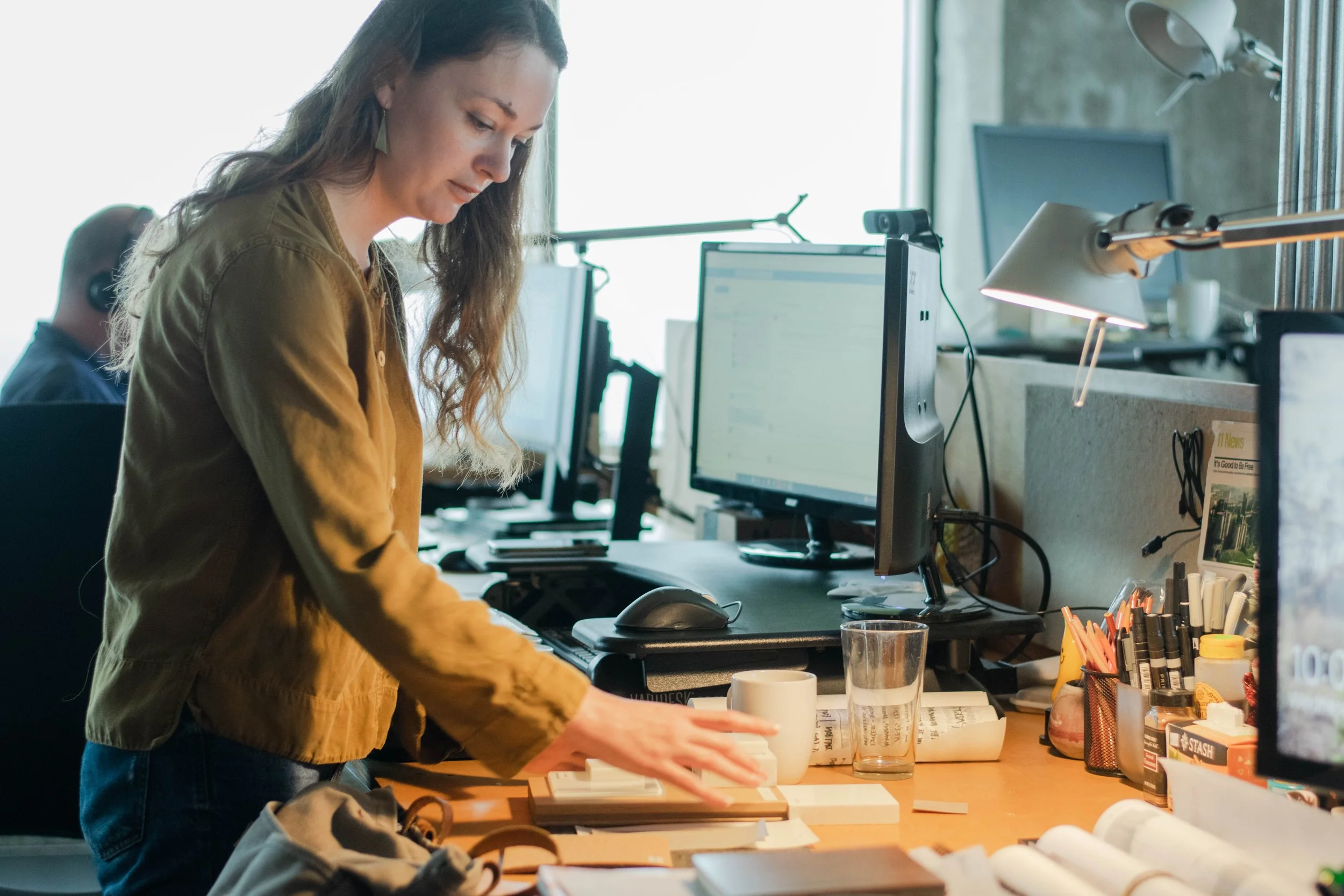 Hannah organizes a flat lay of materials at her desk.