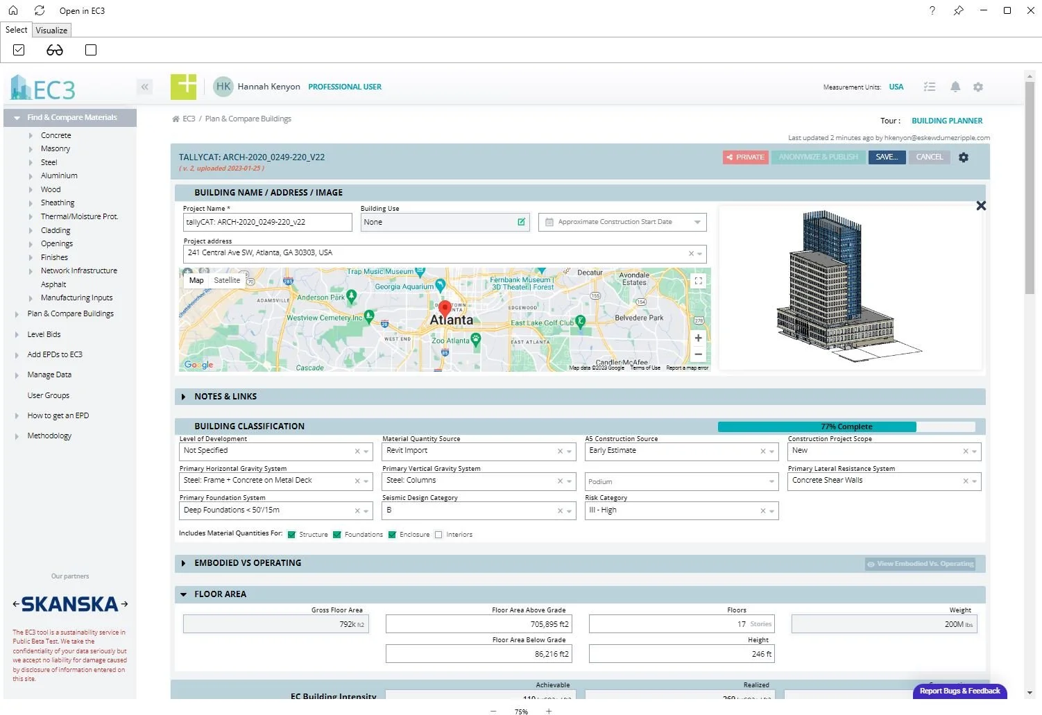 tallyCAT is already making its rounds within the firm, having been used to model embodied carbon emissions for projects such as Tech Square 3, a high-rise project on Georgia Tech’s expansion into downtown Atlanta that will break ground this year. “Will Netter, one of the Project Architects for our design team, our structural consultant Uzun+Case LLC, and I ran Tally models for Georgia Tech,” Hannah says. “Now I can compare the numbers we got from Tally to the tallyCAT numbers to make sure that I’m using the tool correctly and seeing what finer levels of information are available to us.”