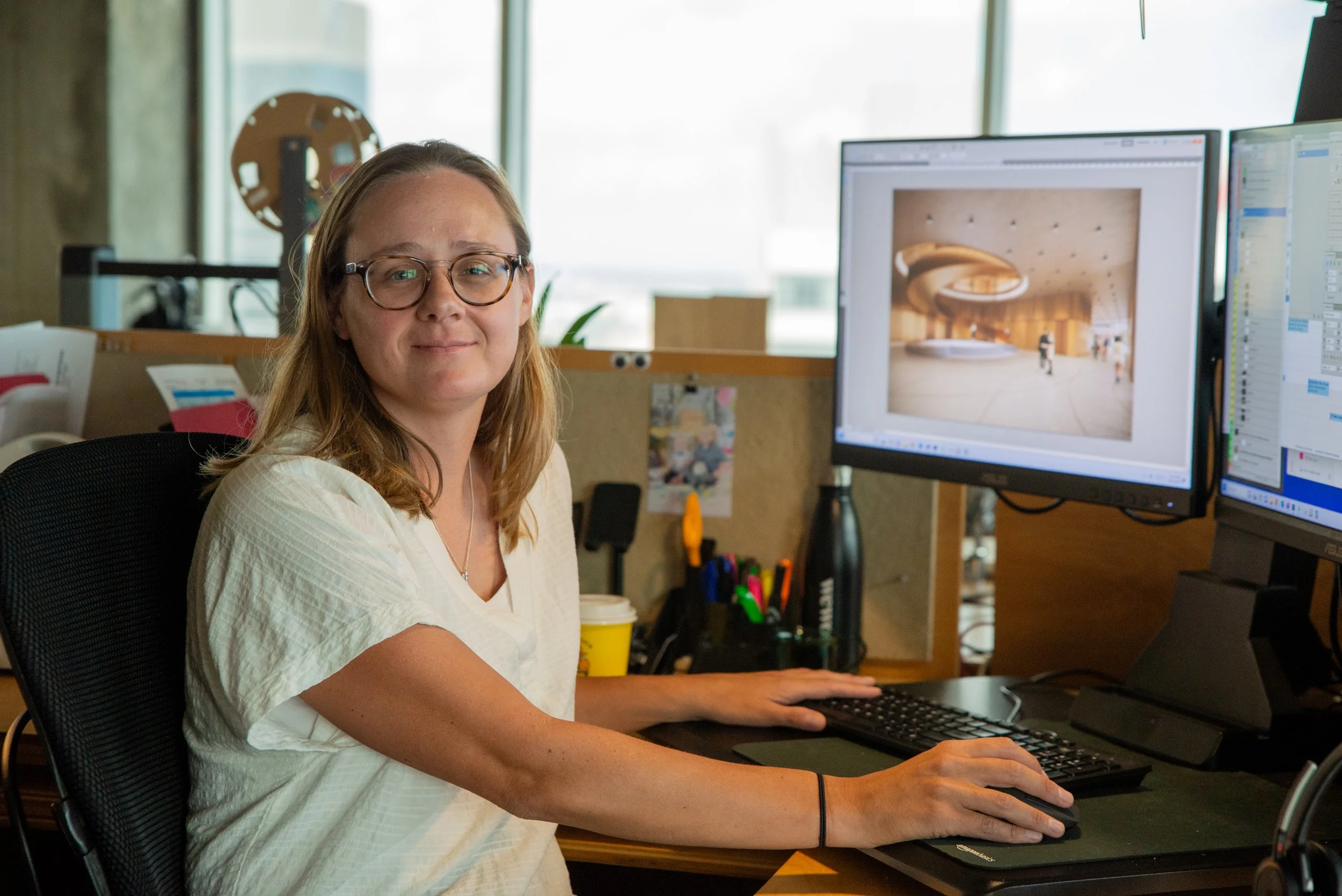 For Sheena Garcia, her role as a senior visualization specialist is a daily practice in storytelling. She creates narratives through visuals that capture the essence of architectural designs. Whether it's the interplay of form, the movement of light, or the harmony of materials, Sheena understands that the renderings she creates can elicit certain feelings for both clients and architects, and this responsibility of communicating the pathos of a project is one that she takes on proudly.
