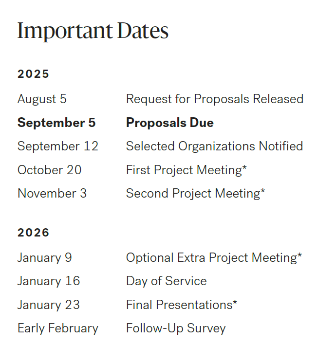 3. DAY OF SERVICE: The Day of Service (Friday, January 16, 2026) is a workday dedicated to producing the deliverables as agreed upon during the planning meetings. Representatives from the nonprofit organizations will check in with their design team to give feedback on progress. Please have at least one in-person representative.