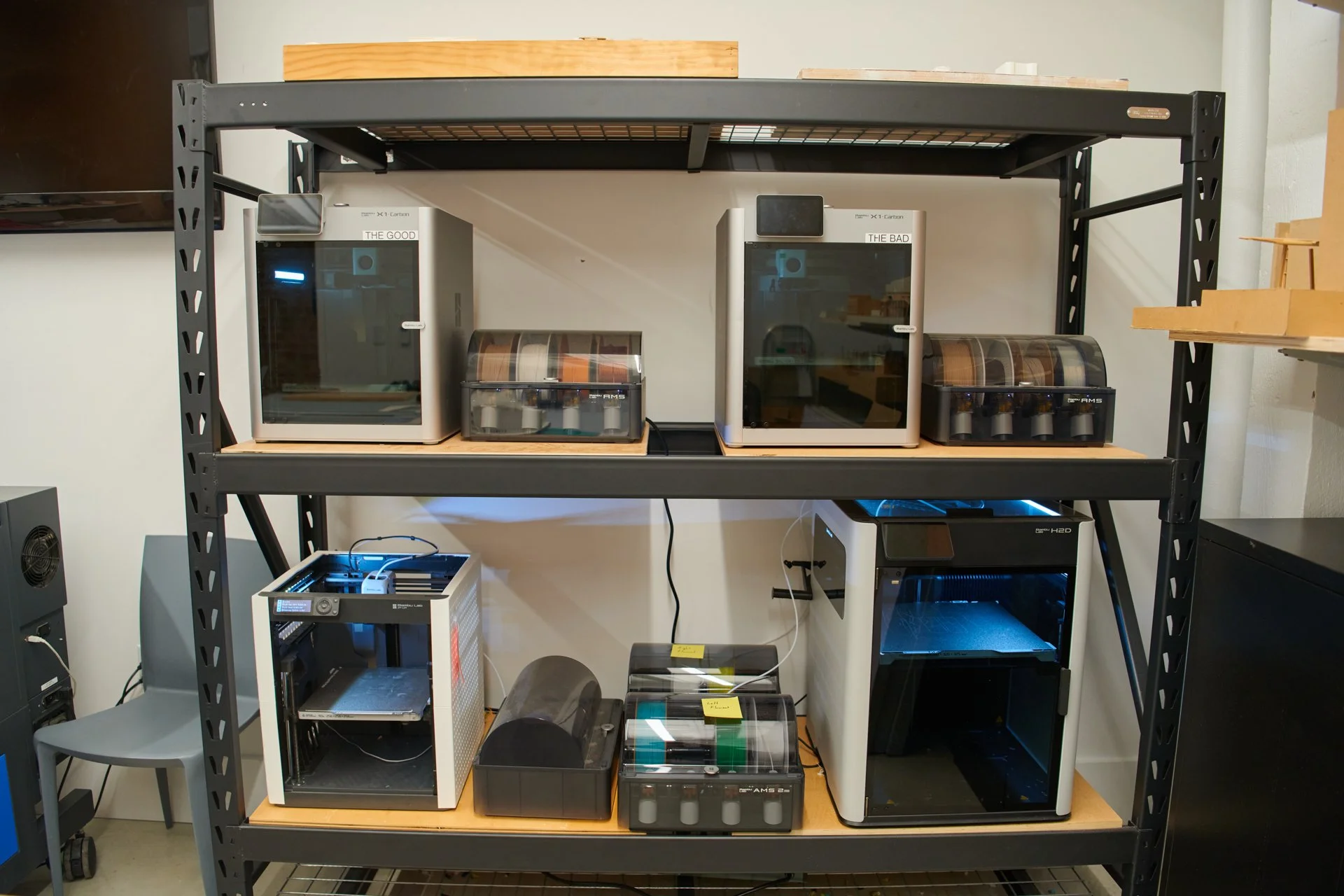 The new studio includes a dedicated wood shop and digital fabrication area equipped with 3D printers and laser cutters, reinforcing the firm’s continued commitment to hands-on making alongside digital workflows.
