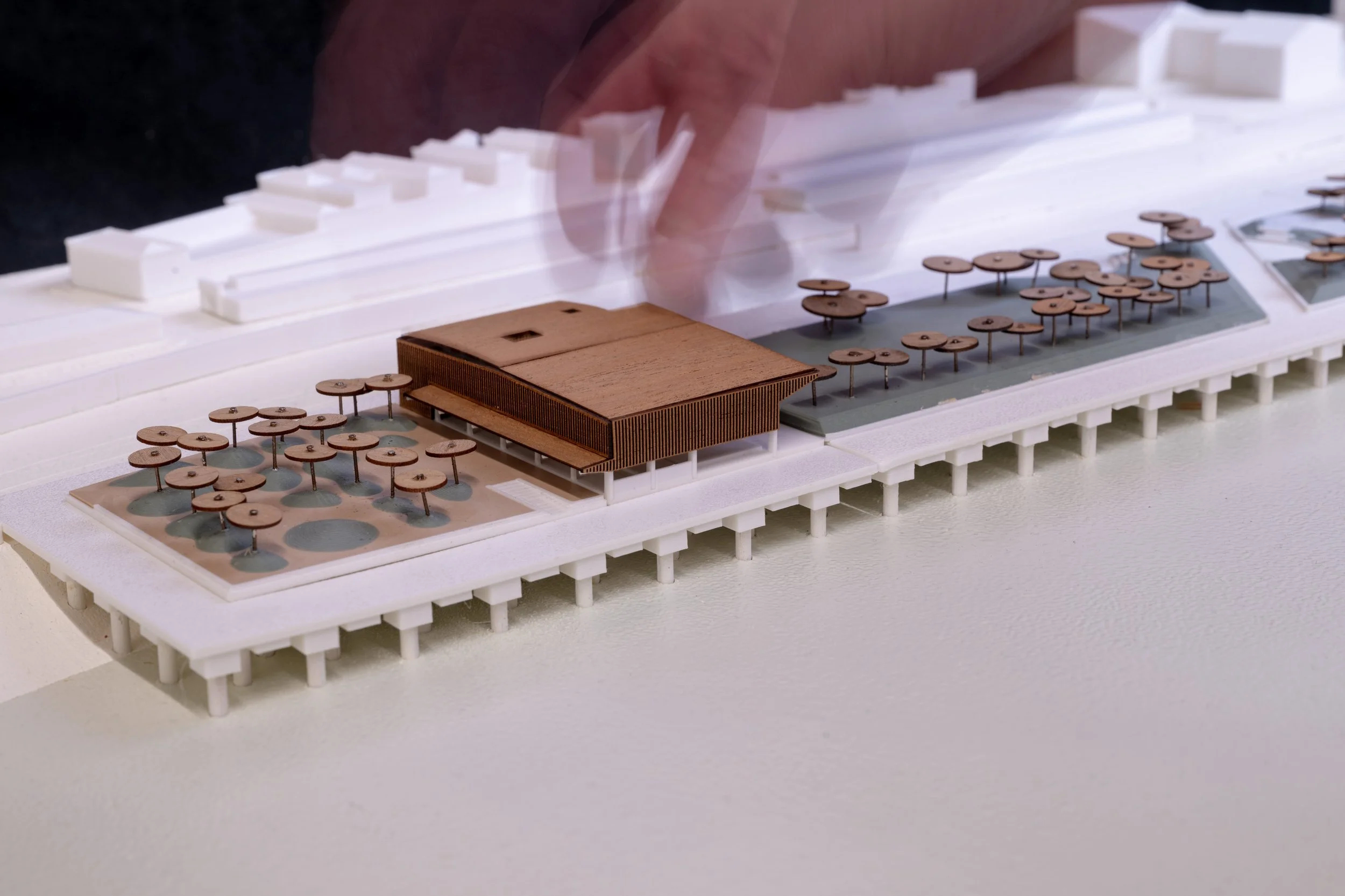 Throughout the design process, the team explored multiple iterations to resolve the complex relationship between landscape, structure, and public use. Chris played a key role in that exploration through an intensive model-making process, building detailed physical models that helped the design team, client, and community visualize how the project would take shape along the river. The models became a critical tool for testing ideas and communicating the spatial experience of the park long before construction began.